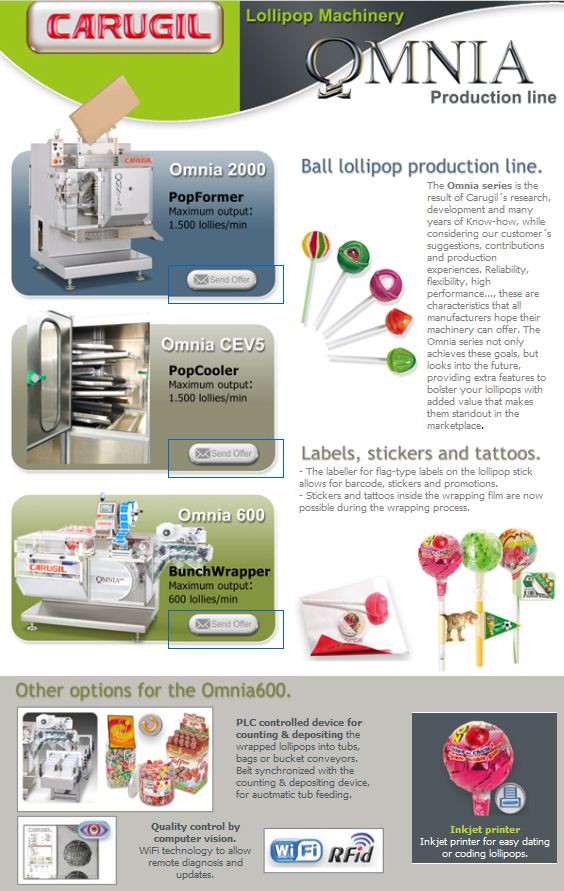 Omnia series of lollypop wrappers are new and innovative wrapping machines from Carugil. The Omnia machine is the result of many years of experience, research and development and has been developed while taking into account suggestions and production experiences of Carugil’s worldwide customer base. This new machine provides reliability, flexibility, efficiency, high performance and offers the producer extra features that will bolster his lollypops with added value that makes them stand out in the market place. The machine integrates labellers, inkjet printer, computer vision quality control, integral control and communications, automatic filling device,a self cleaning system to remove any powders in the feeding area, stand-by reelholder, automatic splicer, centering systems and more. The machine can do either a tight seal around the stick or leave a small easy opening lip. The sealing elements use electric resistance heaters with low power consumption.